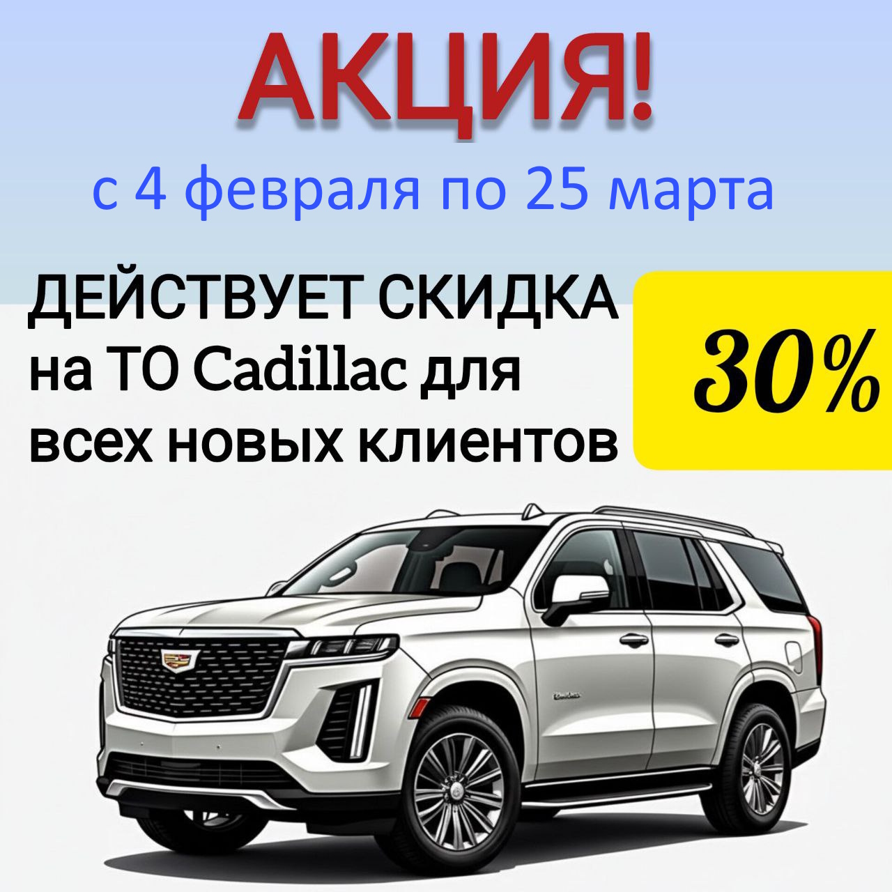 С 20 января по 2 февраля Westline Service предлагает всем новым клиентам уникальную возможность — получить скидку 30% на техническое обслуживание автомобилей Cadillac! Если...